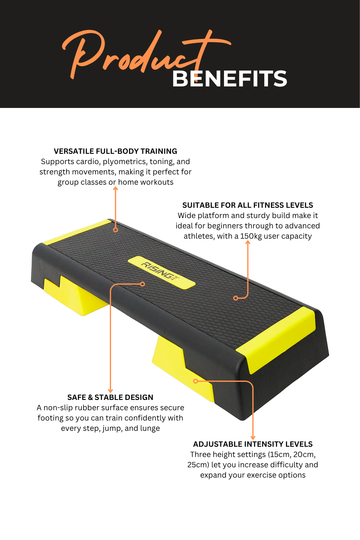 Variety in training is key to progress and with the Body Iron Rising Pro Commercial Aerobic Step, no two workouts are ever the same. This is the ideal platform for group classes to perform a large range of basic and more complex exercises from cardiovascular and plyometric training to lower body muscle toning; its versatility is ideal for mixing up any workout program.