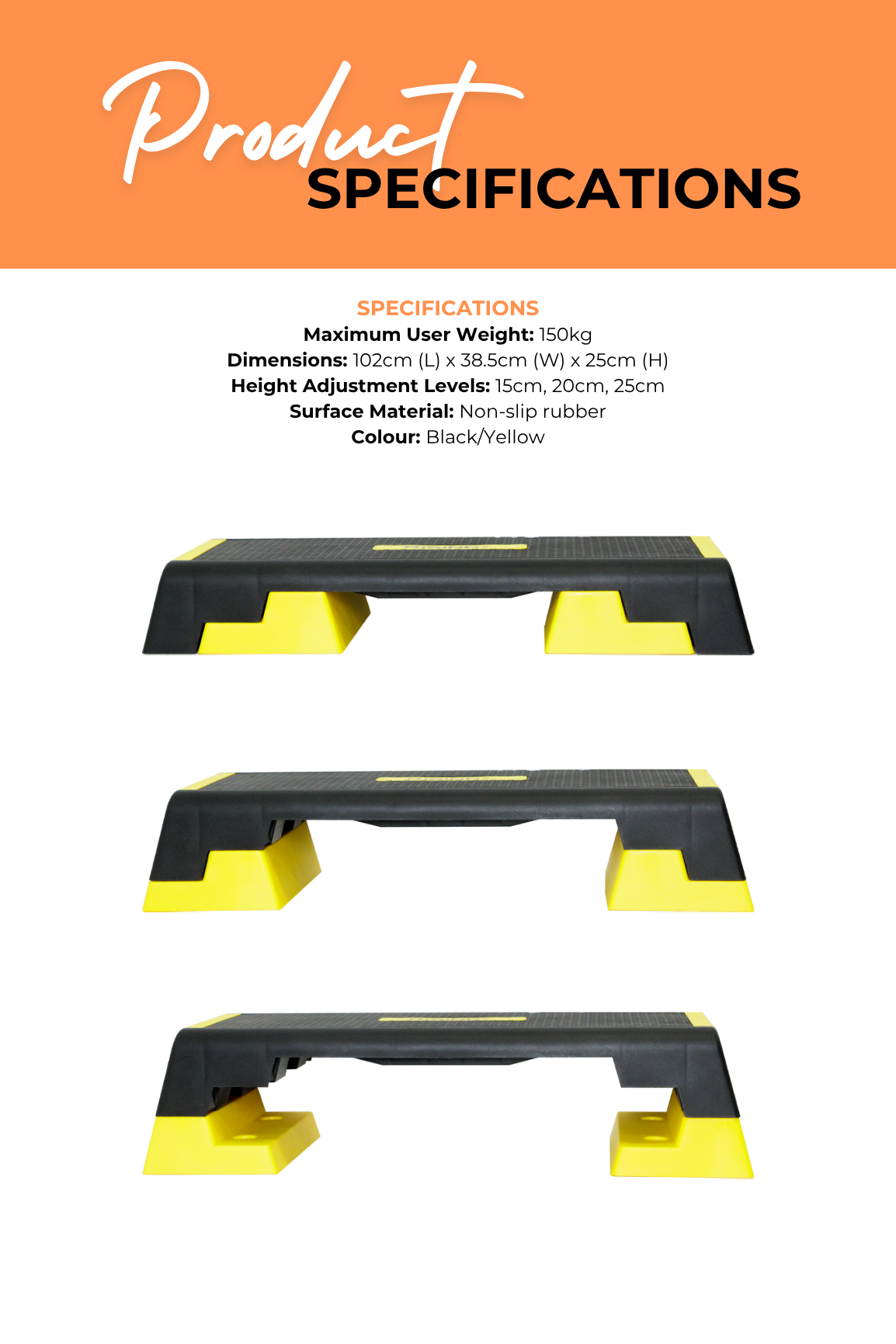 Sturdy and durable for every lunge and jump, the Body Iron Step's non-slip rubber surface means the user can focus on their form and positioning, plus it can be height adjusted from 15cm (5.9") to 25cm (9.8") in three increments for added intensity. The Colour of the Step is Black/Yellow.