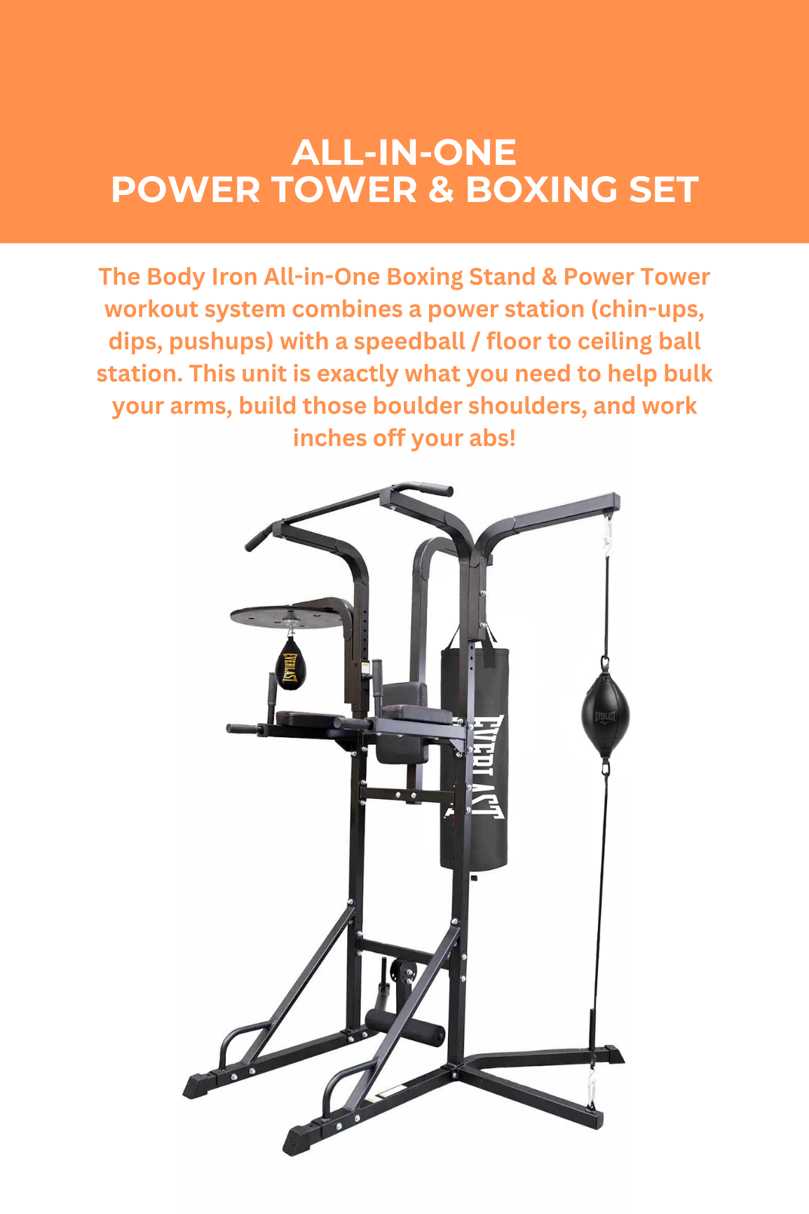 The Body Iron All-in-One Boxing Stand & Power Tower workout system combines a power station (chin-ups, dips, pushups) with a speedball / floor to ceiling ball station. This unit is exactly what you need to help bulk your arms, build those boulder shoulders, and work inches off your abs!
