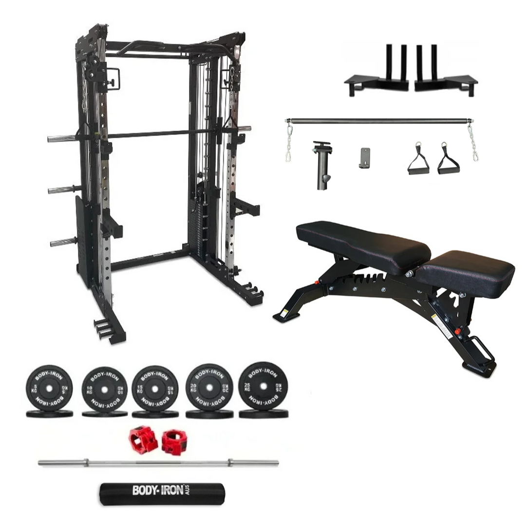 - Body Iron FTG30 Functional Trainer + Adjustable Bench + 100kg Olympic Barbell & Bumper Plate Set