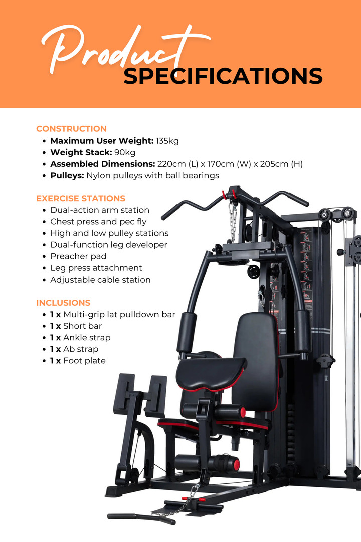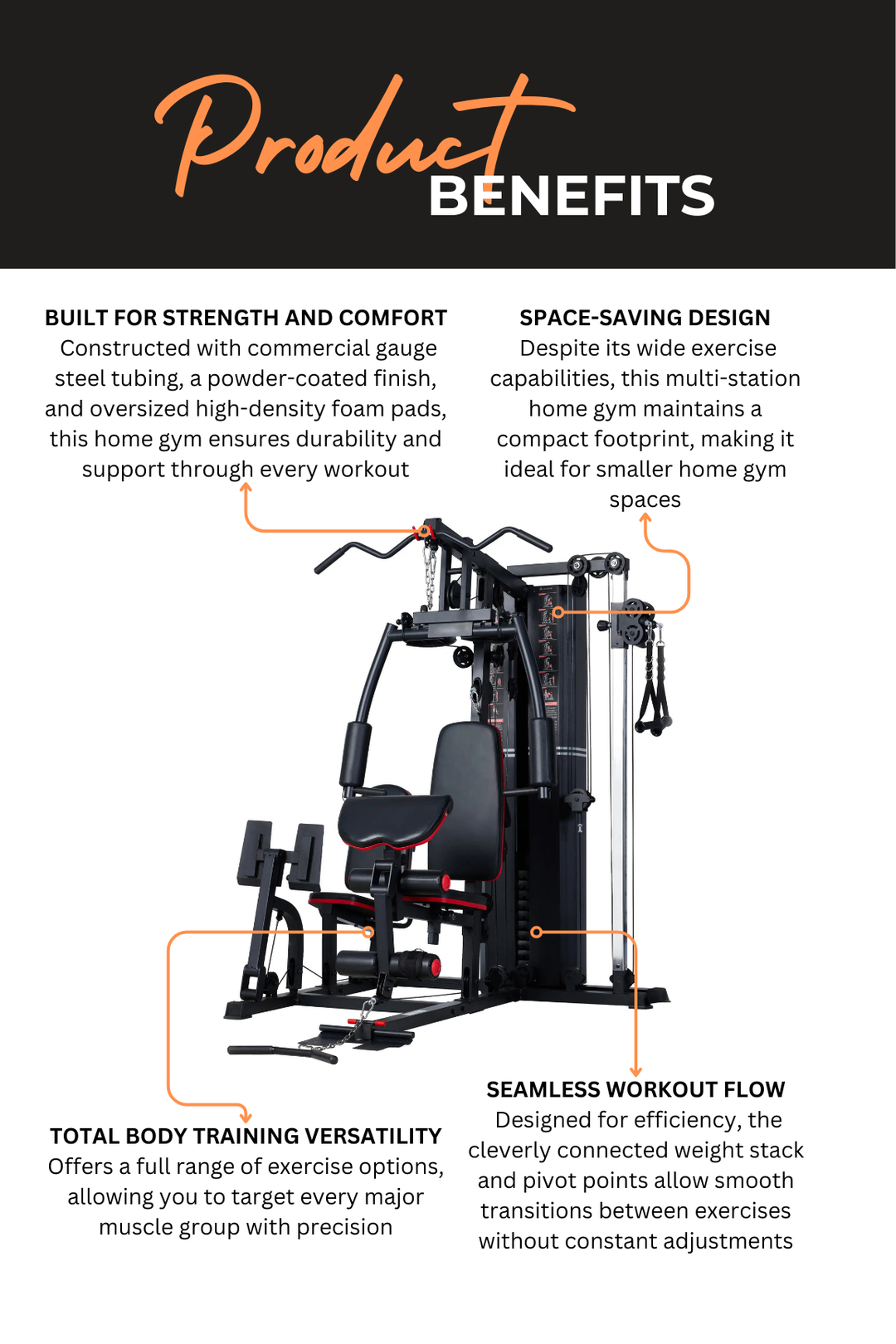 Perfect for both beginners and seasoned athletes, the multi-gym provides multiple attachments including lat bar, shiver bar, ankle strap and single handle for challenging workouts that target all major muscle groups.