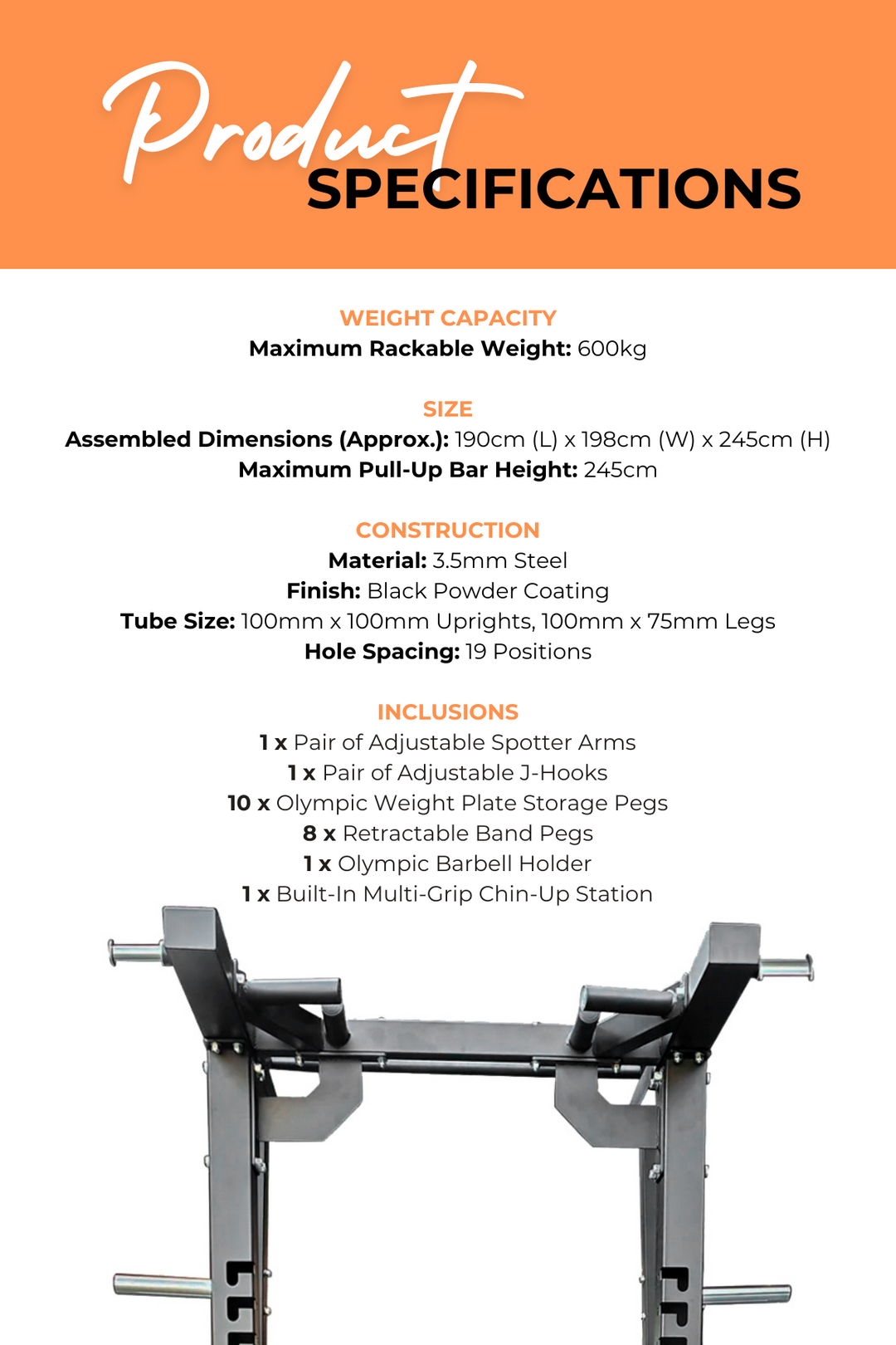 - CONSTRUCTION: Made from 100mm X 100mm tubing, this half rack has been built with thick, durable steel that will last you years to come. It’s wide frame design not only makes it extremely easy to manoeuvre equipment in an out of the inside area, but it offers extra stability and support. You also have the option to bolt the Ultimate Half Rack into the floor to ensure it does not move.
