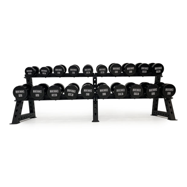 This Body Iron dumbbell set includes 10 pairs of premium rubber dumbbells, with each pair increasing by 2.5kg increments. This enables you to continuously challenge yourself and gradually build strength.