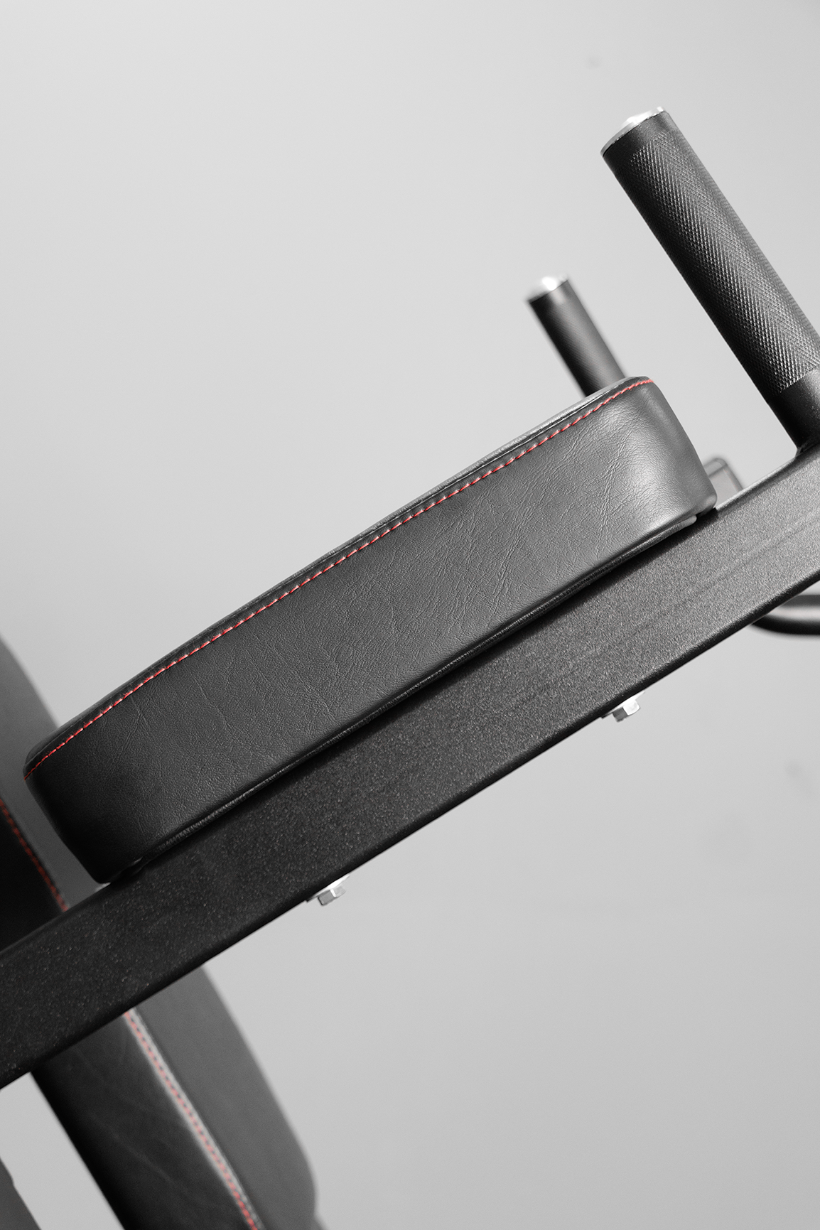 and lower body strength training. With curved elbow and foot pads, extra-wide handles, and a full-contact back pad, this station provides enhanced stabilization and comfort for exercise. Further, raised handles allow for a deeper range of motion during dip exercises.