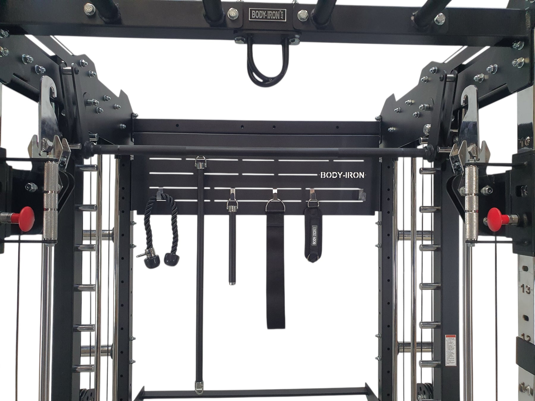 The All-In-One Functional Trainer & Smith Machine Also comes with a Pair J-Hooks & Pair Spotter Arms so you can do all the same exercises that you would do on a Half Rack or Power Rack.