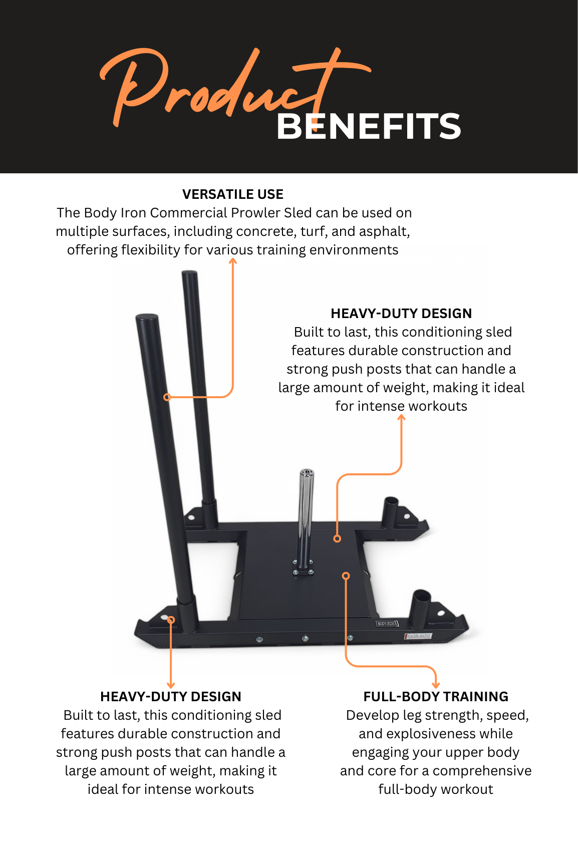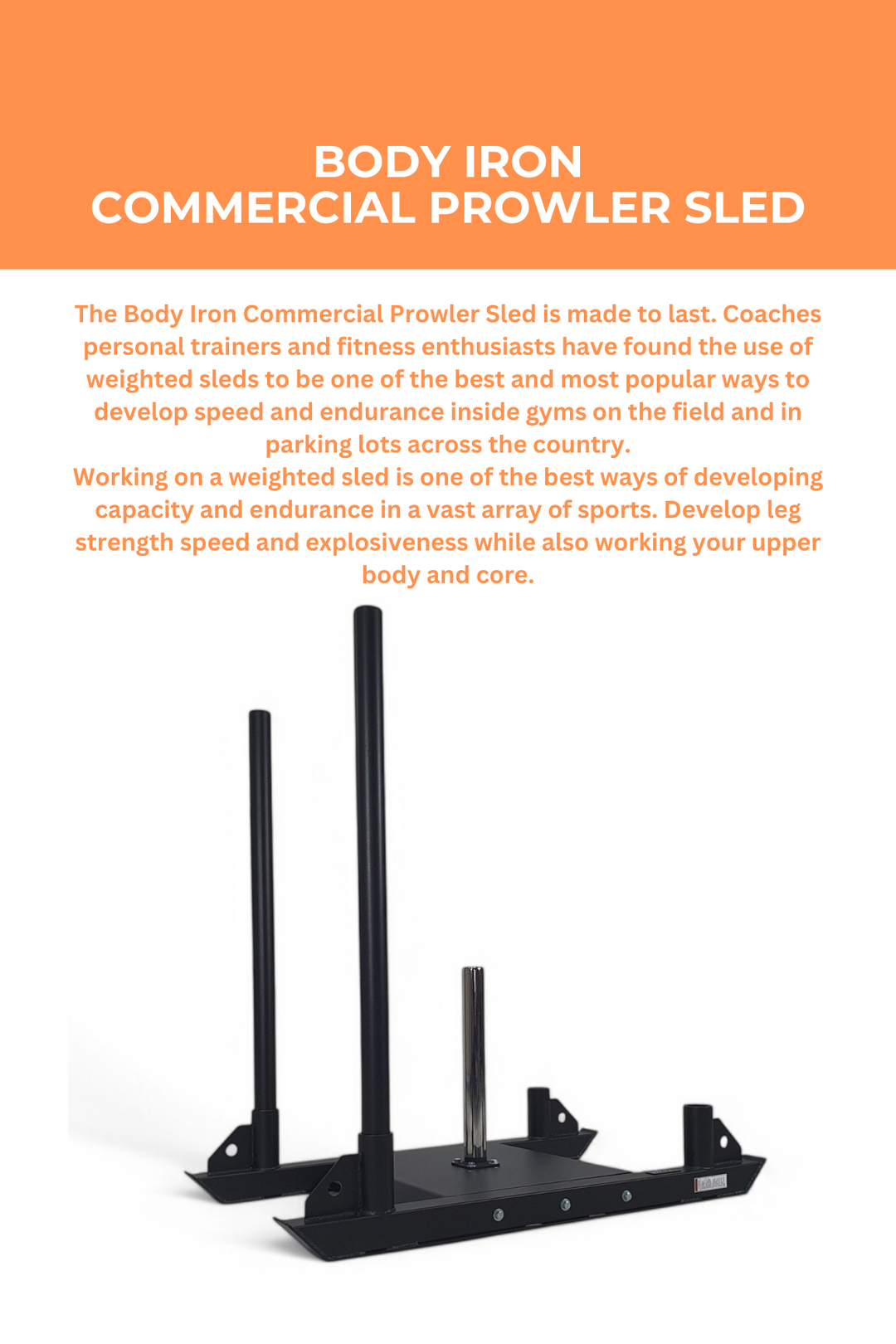 The Body Iron Commercial Prowler Sled is made to last. Coaches personal trainers and fitness enthusiasts have found the use of weighted sleds to be one of the best and most popular ways to develop speed and endurance inside gyms on the field and in parking lots across the country.