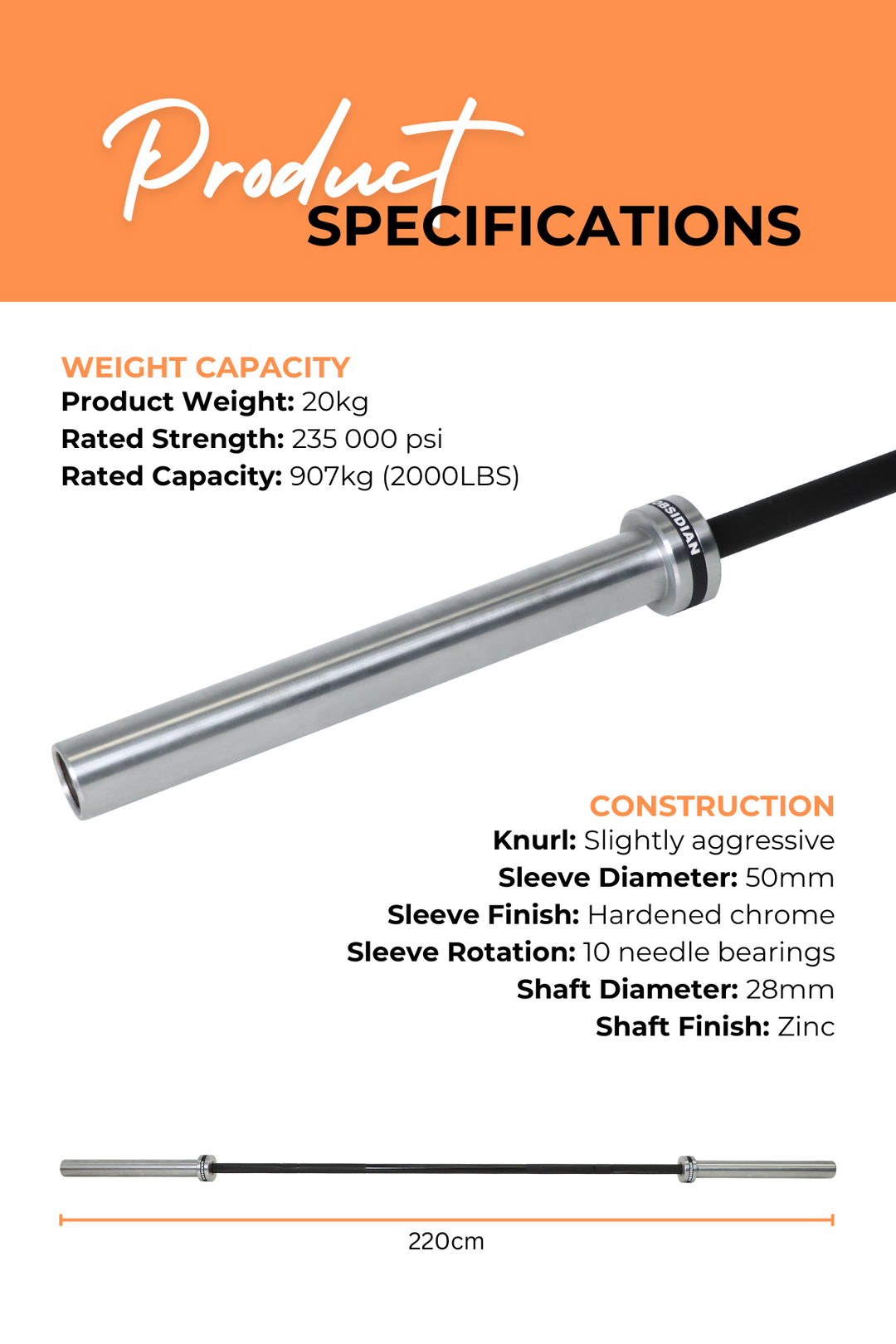 Featuring a 28mm handle and standard knurl, the Obsidian Olympic barbell enables you to secure a strong, tight grip for all types of lifting, including body building, powerlifting and Olympic movements. In fact, this bar meets all IWF and IPF requirements for competition use, making it the ultimate weightlifting tool!