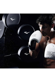 man in white boxing gloves striking focus pad